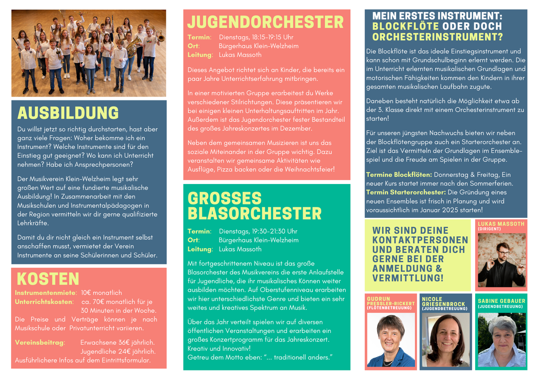Der Musikverein Klein-Welzheim legt großen Wert auf eine fundierte musikalische Ausbildung. In Zusammenarbeit mit den lokalen Musikschulen werden qualifizierte Instrumentallehrer vermittelt, und um nicht gleich ein Instrument anschaffen zu müssen, vermietet der Verein Instrumente an seine jungen Schüler.